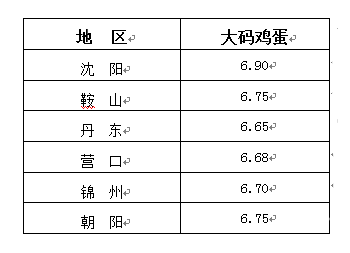 【价格看板】据12316金农热线统计,上周辽宁地区大码鸡蛋平均收购价格为6.72元/公斤,环比下降2.04%,同比上涨70.81%,其中最高价格为7.70元/公斤,出现在锦州凌海等地区;最低价格为6.40元/公斤,出现在丹东东港等地区。