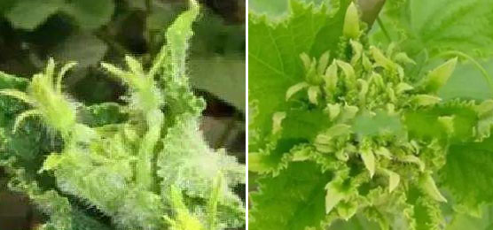 植株不再有新叶和新梢长出,生长点不再生长和伸长,顶端小叶片密集,中下部浓绿、表面多皱缩和突起。如不及时采取措施植株将很快死亡。